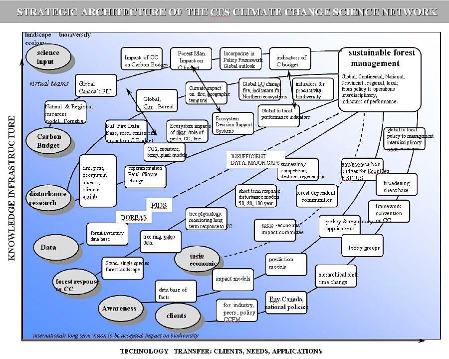 In the mid-1990’s the Canadian Forest Service (CFS) demonstrated clear innovation and visionary leadership by launching new national and international programs of strategic and scientific acclaim, such as the Model Forest, and Criteria and Indicators for Sustainable Forest Management. CFS also implemented a business planning approach to its 10 science and technology networks. As part of this innovation in management, a “Science-Marketing” review was carried out, making extensive use of strategic architecture mapping linked to a modified form of Ansoff’s management grid. This exercise covered all 10 science and technology networks of the CFS (e.g., Biodiversity, Fire Management, Climate Change, Forest Health, etc.). This exercise involved more than 150 scientists and research managers across CFS and was led by Dr. Bill Cheliak and Dr. Pierre Charest. The strategic architectures are still relevant today when dealing with issues like sustainable forest management and climate change.(Figure 3)