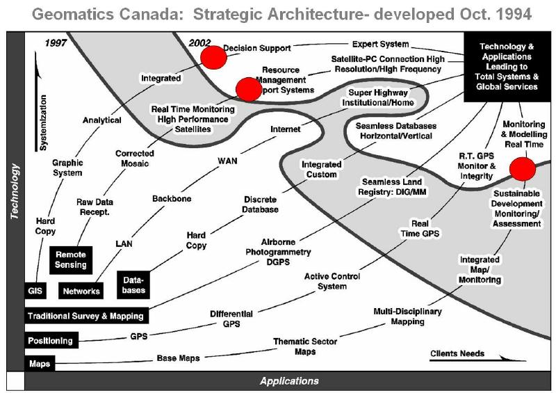 Figure 1 shows the strategic architecture as it was somewhat simplified and integrated in the strategic plan. This strategy map which, in its earliest form, was actually compiled in October of 1994, showed the dramatic acceleration of the Internet. At that time the National Atlas Information Service (NAIS) had just delivered the first web-GIS functionality with access to some major national data bases (National Pollutant Release Inventory from Environment Canada, Geographical Names, NRCan and its own Atlas Mapping Service– NAIS map). My own original version of this map includes a real-time GPS watch towards the end of the GPS line. It is interesting that now, in 2007, we can look back and assess whether these “predictions” have become a reality. From a program development and organizational perspective, the development of the GeoConnections Program and the establishment of the GeoAccess Division within Geomatics Canada were logical outcomes of this strategic vision.