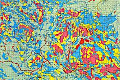 The agricultural capability classification from the 1:250'000 CLI is superimposed on a digital terrain model. The shaded relief enhances the relationships between the capability classification and the geomorphology , soils and glacial and post glacial history. The warm coloured hart of the map is formed by the glacial delta of the Assiniboine river. The former glacial lake beaches, starting at the slopes of Riding Mountain National Park in the top-middle of the map image, diagonally devide the right half of the map: The glacial lake plain with lacustrine clay deposits on the east side, and a predominance of ground moraine material on the west side.