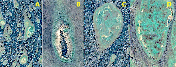 Below is a series of aerial photographs which show the relationship of melting to the size of the permafrost landforms. This is Figure 4, from page 195 from the paper "Distribution and Thawing of Permafrost in the Southern Part of the Discontinuous Permafrost Zone in Manitoba", published in ARCTIC, Journal of the Arctic Institute of North America, Volume 27, number 3, September 1974