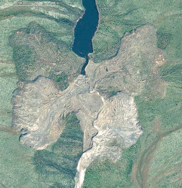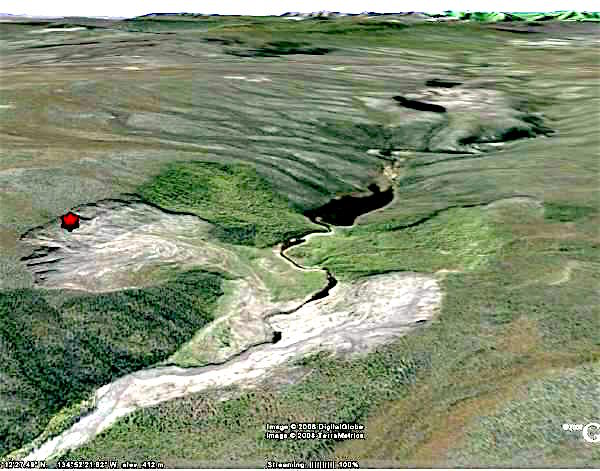 Original source 2007 Digital Globe high resolution image. The red marker is from the selection of regressive permafrost slides marker selection provided by Kingpointnorth. The relative recent disturbed bare soil is clearly visible on both sides of the creek. Also the adjacent areas on both sides show significant sliding area which appear to have been stabilized and are recovered with vegetation.