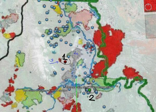 Figure 6: Fire History for the Yukon 1946-2004. The map below depicts the wildland fires since 1946. Source: Yukon Energy, Mines and Resources. The Caribou River area described here is marked with the red marker near (1). The closest fires on this map was (3) which occurred between 1990 and 1999. The Trevor Range Site (green marker) is identified with a (2). It will be interesting to study the blue markers provided by kningpointnorth in relation to fire history. A cursory review of some of the sites in recent and older burn areas seems to imply a link with the fires. Legend: Grey= 2000-2004; Red=1990-1999: Pink=1980-1989; Green= 1970-1979; Orange= 1960-1969; Yellow=1950-1959; Light Green= 1946-1949 (not on this part of the map)
