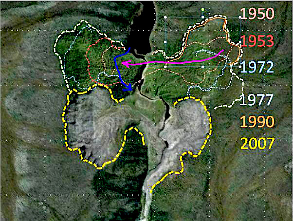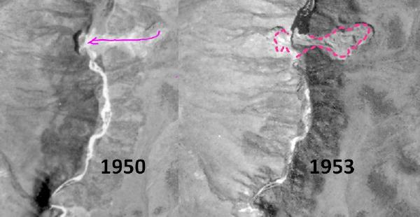 Canada's National and Provincial Air Photo Libraries provide an important environmantal baseline to measure and visualize change. The 1950 National Airphoto Library photo (A12847-144) was taken on August 2nd, 1950 at a height of 20'000 ft. Original scale 1:40'000. The pink arrow shows the flow direction of . The slide, on the south facing slope occurred as a sudden event blocking the flow of the creek and creating a small lake upstream. The drainage channel was pushed into the opposite slope which started to collapse. Both sides continued to melt, but most of the regression in the following decade is in the north facing slope. The 1953 airphoto (A13753-22) was taken on 27 July from 35'000 ft.