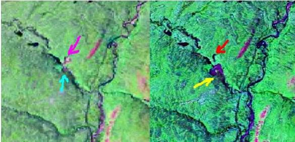 Figure 5: NASA Landsat Pseudo Colour 1990 (left) and 2000 (right). The pink arrow on the 1990 satellite image shows that the south facing slope has become active again. Also the light blue arrow shows the start of the next phase on the north slope. The 1950 and 1970 slide areas still look reasonably stable and are covered with vegetation again. The red arrow on the 2000 image shows a part of the 1950 slide which has become active again: the small dark black area- a mudflow The yellow arrow on the 2000 image points to the dark purple active slide area essentially very similar to the Google Earth image (2007). No fire scars are visible on each of the images.