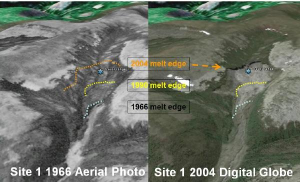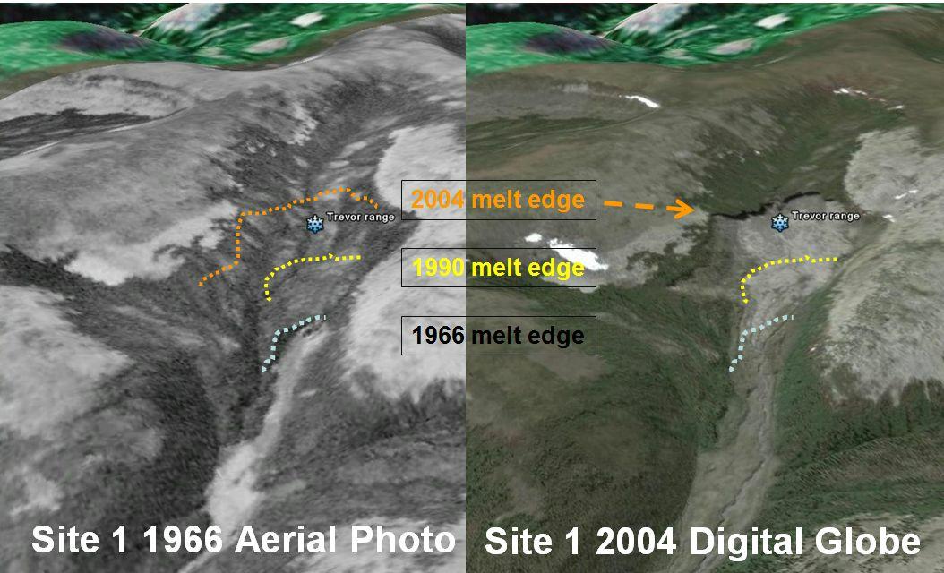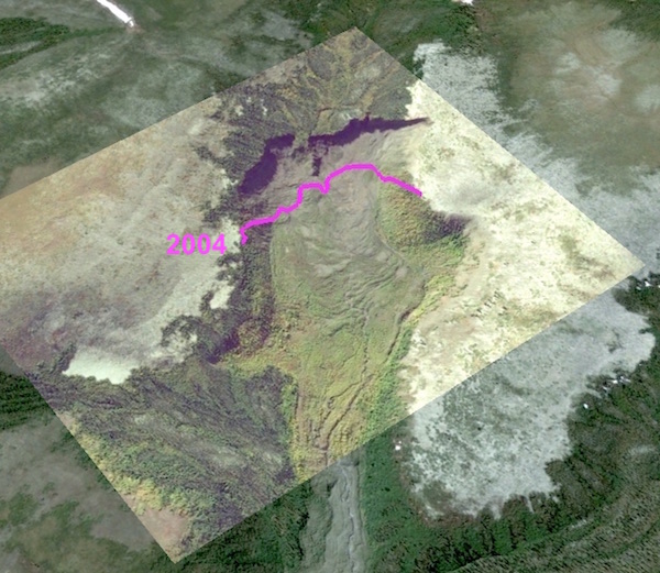 Figure 1 below shows a comparison and interpretation of a series of aerial and satellite images. The left is an 1966 July Aerial photo (A19650-67) draped over a Google Earth. To the right is the Google Earth high resolution Digital Globe July 2004 image. The grey dotted lines show the permafrost melting/ erosion edge in 1966. The Yellow dotted line is derived from a NASA Landsat 1990 low resolution image interpretation (WorldWind) and the orange dotted line is represents the GE 2004 digital Globe image.