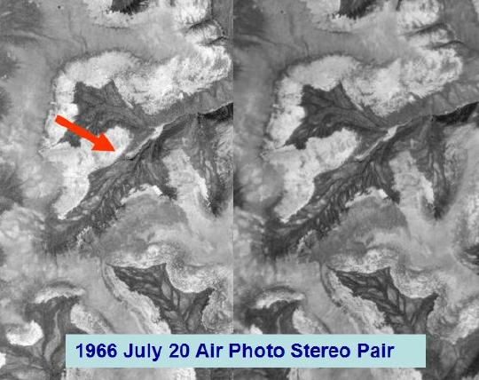 Figure 2 Shows a stereo pair of the 1996 aerial photos of the site. The red arrow shows the start of the slide edge. It is interesting to note that the melting seems to follow the South-east sun facing slope.