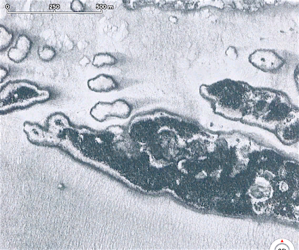 PHOTO 7: 1984 Satellite Image. This Google Earth image shows a significant amount of change from the 1968 photos. Melting around the peat plateau edge is prominent. The small palsas B and C have disappeared.