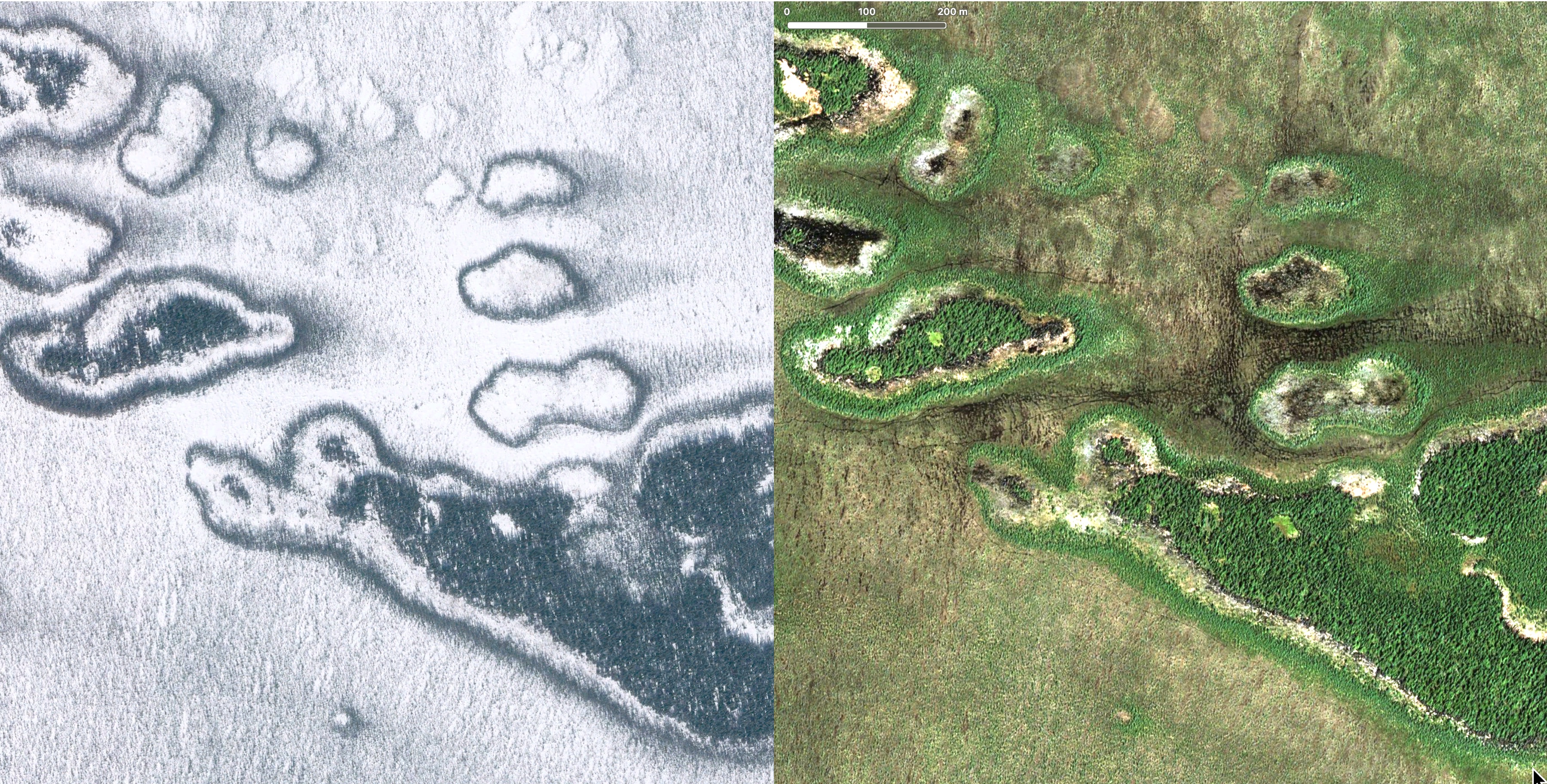 PHOTO 9: 2012-13 Apple Maps winter and summer images. This combination provides an interesting, almost stereo perspective of details of the peat plateau and surrounding areas. Active melting edges are clearly visible on the high resolution summer image even the leaning trees, sinking into the water. The 'historic' maximum extent of the permafrost leaves clear footprints on the winter image. The thin dark edges of stunted Black Spruce and Tamarack, outline the areas where the permafrost has disappeared. The comparison with the 1925 oblique air photo shows that this melting happened after 1925: a period of about 90 years. (large scale image +)