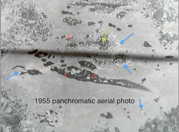 PHOTO 4: 1979 air photo. Significant changes are visible. The blue arrows point to areas which have clearly melted since 1955. Also the area around 3 has been burned. Significant melting is visible in the 'tail' area. Many of the inside collapse areas have increased as well, but not as much as the 'melted edges'. It is remarkable that the area around the green arrow has changed so little since 1955.