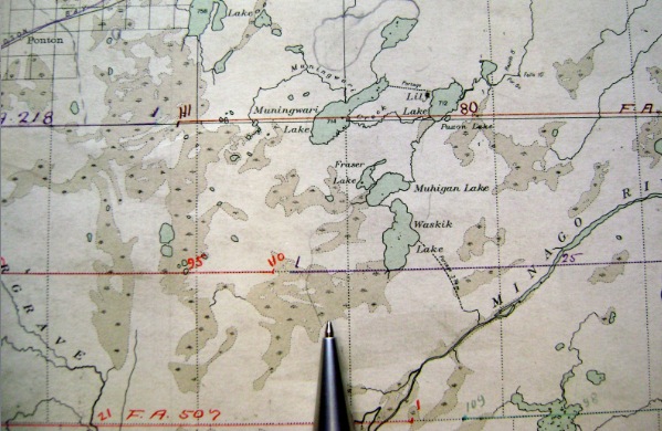 This could actually be the flight crew which took the remarkable aerial photos in 1925. This picture was apparently taken in 1924 before take off from the flight base near Winnipeg (from Alex J. Milne, "Pioneer Survey Flights in Northern Manitoba and Saskatchewan", Canadian Aviation Historical Society Journal 21, no. 4 (1983)). Their work contributed to the making of the old topographic map (MAP 1 below) which shows the actual flight lines and centres of the oblique air photos taken by the crew. The peat plateau was actually mapped as a prominent landform in the surrounding 'muskeg' (see point of the pen).