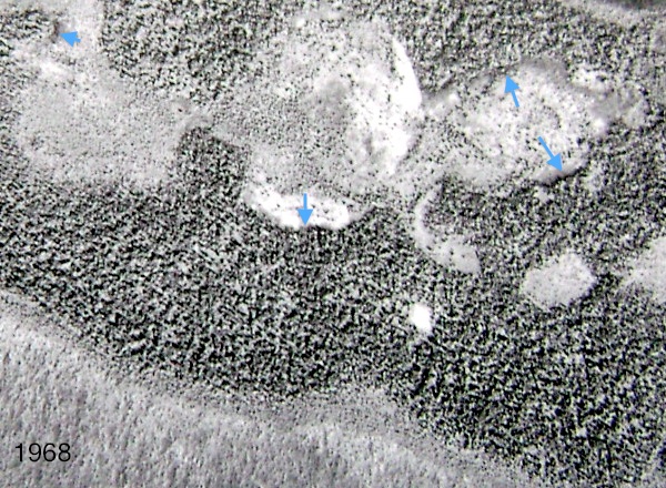 PHOTO 5: Part of the peat plateau in 1968. No melting around the edge can be seen, as was also noted in photo 4 -green arrow. Melting can be seen in the collapsed areas in the centre (see also more detailed image below), but melting rates are quite slow.