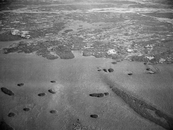 PHOTO 12: 1925 oblique air photo shows the tail end of the peat plateau and a series of smaller palsas in a large tamarack fen wetland. While the area north of the wetland shows all signs of a fire regeneration, the palsas and the tail were not touched by that fire. Note that the edges of the of the palsas and tail of the peat plateau do not show any sign of melting---yet. In fact, this area appeared quite stable until 1955.